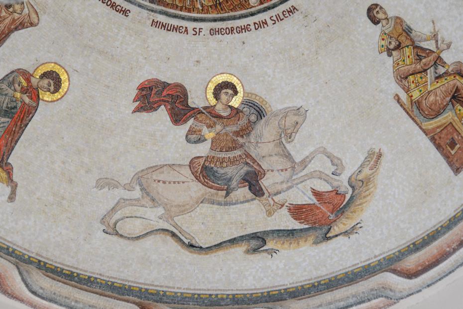Atunci ostaşii cei rânduiţi pentru aceea, răpind pe mucenic legat, l-au dus afară din cetate, târând împreună cu dânsul şi pe împărăteasa cea de bun neam, care, urmând cu osârdie, se ruga lui Dumnezeu în sine, mişcându-şi buzele şi privind adeseori spre cer. Apoi, ajungând la un loc oarecare, împărătesei i-au slăbit puterile şi a cerut să şadă puţin. După aceea şi-a întors capul spre zid şi şi-a dat duhul în mâinile Domnului. Văzând aceasta, Gheorghe, mucenicul lui Hristos, a preamărit pe Dumnezeu şi mergea cu mare bucurie, rugându-se Domnului, ca şi alergarea lui să se săvârşească cu bine. Apoi, când s-a apropiat de locul cel hotărât, unde era să fie tăiat şi-a ridicat glasul şi se ruga în acest chip: